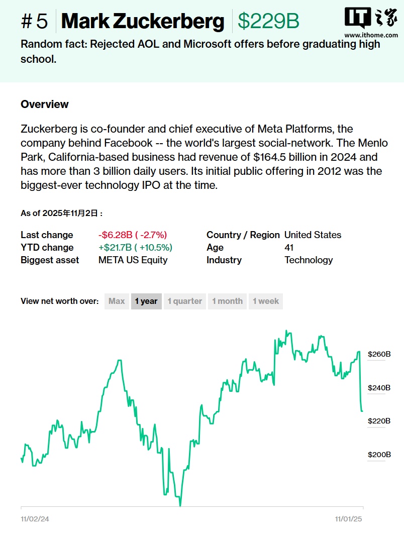 据彭博社,这位 41 岁的首席执行官净资产降至 2352 亿美元(现汇率约合 1.67 万亿元人民币),为其近两年来的最低排名。此次下跌源于投资者对 Meta 计划发行 300 亿美元新债以资助人工智能支出的担忧。这也是彭博财富指数有记录以来第四大单日市场驱动型财富损失。